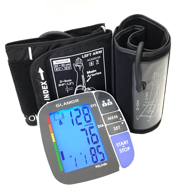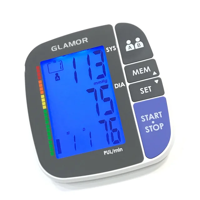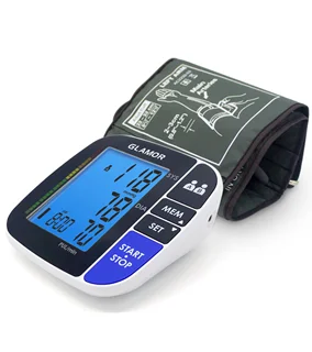 فشارسنج دیجیتال بازویی برند گلامور مدل TMB 1112 NEW (دارای 5 سال گارانتی شرکتی ) مجهز به تکنولوژی WMI می باشد که باعث می شود کاف بازوبند دستگاه بیش از حد باد نشود و از فشار بیش از حد و درد بازو جلوگیری می کند.این فشارسنج دارای جایگاه حافظه 250 عددی برای هر شخص می باشد و دو کاربره می باشد.دارای دو عدد کاف در دو سایز مختلف می باشد که مناسب برای افراد با دور بازوی استاندارد و سایز بزرگ می باشد.منبع تغذیه این دستگاه برق و باتری است و آداپتور مخصوص داخل جعبه دستگاه موجود می باشد.این فشارسنج دارای سیستم تشخیص آریتمی قلب است و وضعیت فشار خون را در چند رنگ مختلف به صورت نواری نمایش می دهد.داخل جعبه فشارسنج دیجیتال گلامور مدل TMB-1112 NEW دو عدد کاف( فنری و ساده) و کیف ضد ضربه نیز دارد. پک کامل اورجینال (شامل آداپتور،کیف ضد ضربه ، دو عدد کاف ) می باشد.
